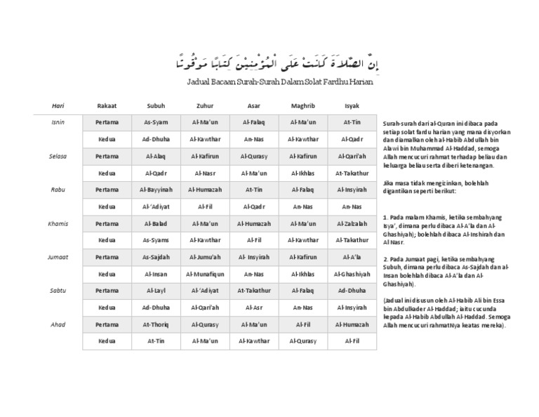 Jadual Bacaan Surah Dalam Solat
